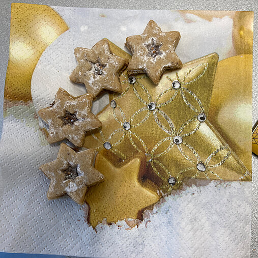 Den Teig auswalken. Sterne ausstechen. Bei der Hälfte der Kekse ein Loch ausstechen.