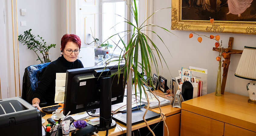 Gerlinde Frank ist seit zwei Jahren im Erzbischöflichen Sekretariat tätig, mit 24 Wochenstunden in der Altersteilzeit. Sie betreut die sogenannte „physische Post“, hauptsächlich viele einlangende Einladungen und Bitten um Grußworte, Ehrenschutz für Veranstaltungen usw. „Es kommt viel persönliche Post, viele berührende und manchmal auch etwas verwirrte Schreiben“, sagt Frank. Weiters ist sie für fremdsprachliche Korrespondenz zuständig, meist Englisch und nimmt auch Diktate des Kardinals auf. Sie betreut außerdem die Priesteraushilfe (Messvertretungen) und erledigt Telefonate und bearbeitet den Schriftverkehr mit den aus der Kirche Ausgetretenen. Der Kardinal schreibt all jenen, die ausgetreten sind und bittet um Rückmeldung der Austrittsgründe. Frank leitet dann den Schriftverkehr an die zuständigen internen Stellen weiter. Sie schätzt „das gute Arbeitsklima im Büro sowie den sehr wertschätzenden Umgang des Kardinals mit uns allen“. Auch sie wird den Kardinal in der Pension begleiten.