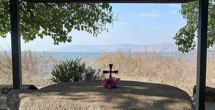 Tag sieben beginnen für uns mit einem Gottesdienst direkt am See Genezareth. Weitere Reiseziele der Gruppe waren Kafarnaum, die wichtigste Wirkungsstätte Jesu. Hier beruft er die ersten Jünger, hier predigt er und hier gab es mehr Zeichen seiner Allmacht als anderswo. Danach folgen Chorazin (den Sitz des Moses kann man hier bewundern) und Kursi (Reste einer byzantinischen Kirche).