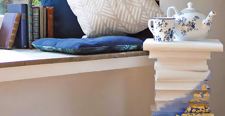So können wuchtige Bände mit Hilfe einer Bohrmaschine, einer Gewindestange (etwa 50 Zentimeter) und dazu passenden Schraubmuttern zu einem Stapel zusammengeschraubt werden: Die großen nach unten, die kleineren nach oben, ganz oben noch einmal ein größeres Buch als „Tischplatte“ platzieren. Nach dem Zusammenschrauben wird der Bücherstapel mit Wandfarbe gestrichen und mit Blattgold verziert. Auf diese Weise kann ein dekoratives Abstelltischchen für die Leseecke (siehe Bild oben) oder für einen Blumentopf entstehen. Auch in so manchen Kirchenräumen könnten die verwandelten Büchertischchen zu einem Hingucker werden oder als kleine Ablagetische dienen.