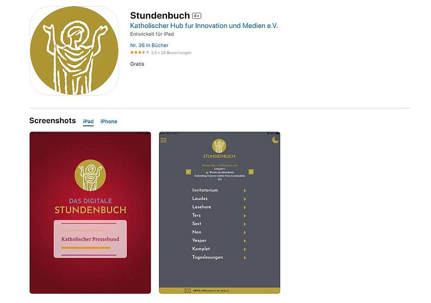 Die „Stundenbuch“-App stellt alle Texte des „Großen Stundenbuchs“ zusammen, einschließlich liturgischer Lesungen, und ist auch für Anfänger ohne Vorwissen leicht zu bedienen. Die Texte werden für zehn Tage im Voraus geladen und können offline genutzt werden. Mit der „Glockenturm“-Funktion kann man sich regelmäßig an die Gebetszeiten erinnern lassen. Die App ist kostenlos, es kann aber gespendet werden.