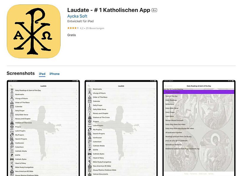 Die Laudate-App ist eine katholische Gebets- und Andachtsapp, die verschiedene Funktionen wie tägliche Lesungen, Meditationen, Rosenkranz-Podcasts und Gewissenserforschung anbietet. Hier kann man auch den Rosenkranz interaktiv beten – das heißt, dass man auf einem Bild des Rosenkranzes auf die einzelnen Perlen klicken kann, um ein Kästchen mit dem Gebetstext zu öffnen. Laudate gibt es ebenfalls für Android oder iPhone. Der Nachteil hier: Der Text ist oft sehr klein geschrieben.