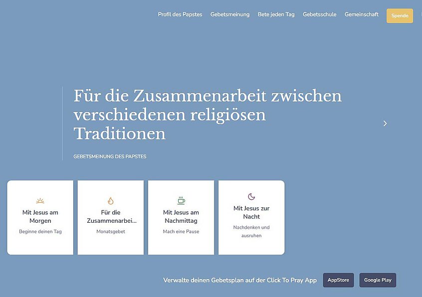 „Click to Pray“ wurde von Papst Franziskus 2019 gestartet. Die App lädt Gläubige rund um den Globus ein, mit dem Papst gemeinsam zu beten. Auch Papst Leo XIV. hat in der App ein offizielles Gebetsprofil. Neben dem Monatsgebet findet man hier auch Gebete für eine Pause zwischendurch oder Morgen- und Abendgebete. Die Anwendung ist in sechs Sprachen (Englisch, Italienisch, Spanisch, Französisch, Portugiesisch und Deutsch) für Android und iOS erhältlich.