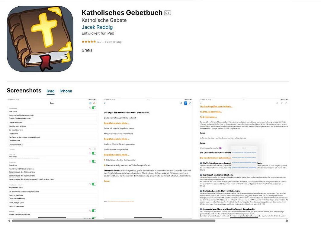 Das Gebetsbuch enthält die wesentlichen katholischen Gebete und erklärt auch, wie man den Rosenkranz betet. Außerdem kann man sich Gebete für später abspeichern. Auch diese App ist kostenlos. Die App ist in den Sprachen Deutsch, Englisch, Französisch, Italienisch, Polnisch, Portugiesisch, Slowakisch, Spanisch, Tschechisch und Ukrainisch erhältlich.