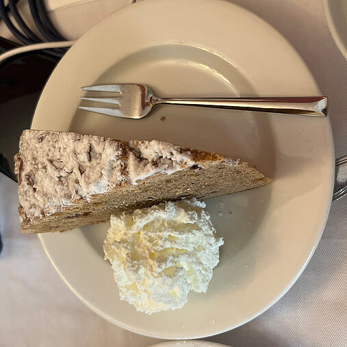 Im Café Triest des österreichischen Hospizes serviert Geschäftsführer Lucas Maier zur SONNTAGs- Jause vor Weihnachten Capuccino, Melange, Apfelstrudel und den im Haus kreierten Triest-Kuchen – natürlich mit Schlagobers: „Ein Stück Österreich im Heiligen Land“, weiß Maier, der auch herzlich zur freiwilligen Mitarbeit im Hospiz einlädt.