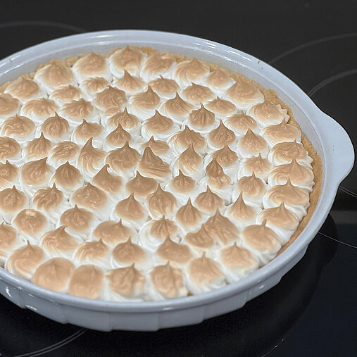 Danach das Lemon Curd auf den Teig streichen (beides muss kalt sein). Vier Eiklar aufschlagen und mit circa 150 Gramm Staubzucker sowie dem restlichen Zitronensaft sehr steif fertig schlagen. Eiweiß-Tupfer aufspritzen und im Herd bei 200 Grad (zirca zehn Minuten) bräunen lassen. Auskühlen.