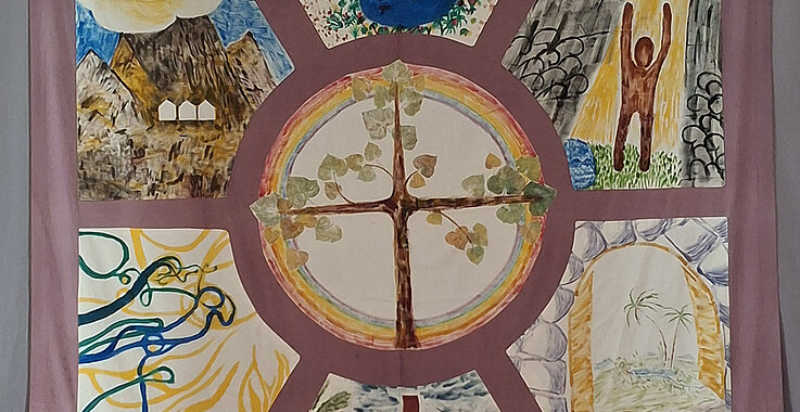Schon 1987 gestalteten verschiedene Gruppen der Pfarre Hütteldorf (Wien 14) zu den Evangelien der Fastensonntage des Lesejahrs A ein „klassisches“ Fastentuch. Links unten beginnend, zeigt es am 1. Fastensonntag wirre Linien, die die Versuchungen Jesu in der Wüste darstellen. Im Uhrzeigersinn weiter betrachtet, endet es unten Mitte mit Ostern: Im Kreuz ist Heil – es gibt Hoffnung.