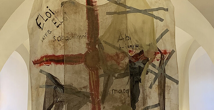 Das diesjährige Gallbrunner Fastentuch thematisiert all das, was täglich auf uns einwirkt – Sorgen, Krisen und Belastungen. Über allem steht jedoch das Kreuz als Zeichen der Hoffnung und des Heils. Die Schriftzüge in Latein und Aramäisch nehmen Bezug auf die letzten Gebete Christi und verleihen dem Werk dadurch besondere Tiefe. Gestaltet wurde das Fastentuch von Christoph Wallner, Organist in mehreren Pfarren im Bezirk Bruck an der Leitha.