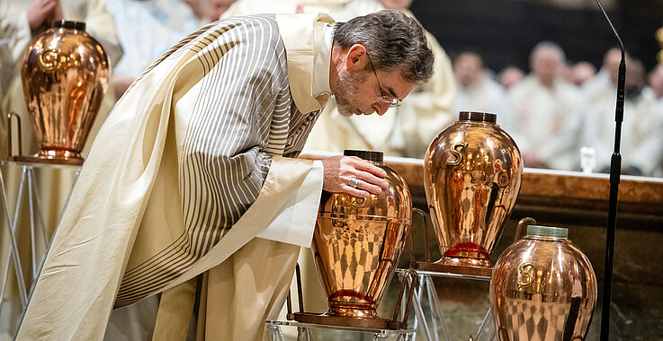 Auf die energiespendende Kraft der Sakramente speziell in Krisenzeiten und Zeiten der Niedergeschlagenheit hat Erzbischof Josef Grünwidl bei der Chrisammesse am 30. März im Stephansdom hingewiesen. „Die heiligen Öle wollen uns Gottes Energie schenken, dem Leben Glanz verleihen und Balsam für die Seele sein“, sagte Grünwidl. Das Katechumenenöl wurde für die Salbung der Taufbewerberinnen und Taufbewerber geweiht, das Krankenöl für die Krankensalbung zur Stärkung, Belebung und Heilung an Leib und Seele. Der Chrisam wird verwendet zur Salbung bei den Sakramenten der Taufe, Firmung, Priester- beziehungsweise Bischofsweihe sowie bei der Weihe von Altären, Kirchen und Glocken. Der Erzbischof hauchte bei der Weihe über den Chrisam (Bild) und betete das Weihe-Hochgebet.