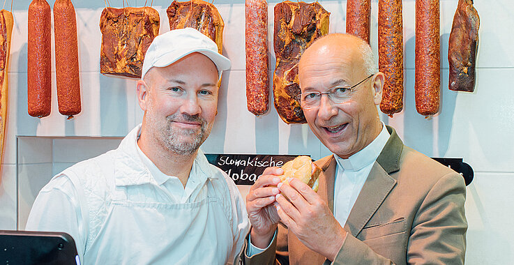Dompfarrer Toni Faber stattete vergangene Woche der Fleischerei Hödl einen Besuch ab, um sie nach umfassenden Umbau- und Renovierungsarbeiten feierlich zu segnen. Als Jugendlicher verdiente Toni Faber sich als Postbote ein kleines Taschengeld dazu – und die Fleischerei Hödl lag auf seiner Route. Die Leberkäse-Semmel schmeckt ihm heute noch.