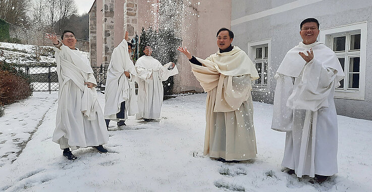 Die beiden Heiligenkreuzer Patres Vinzenz und Hilarius aus Vietnam sahen jüngst zum ersten Mal in ihrem Leben Schnee. Denn in ihrem tropischen Heimatland kennen sie so etwas nicht. An der Hochschule studieren derzeit sechs vietnamesische Patres.