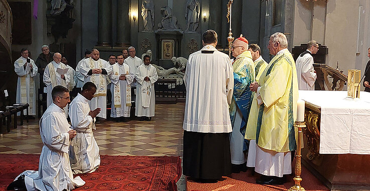 „Seid bereit, den Menschen zu dienen“: Dazu rief der Belgrader Erzbischof Kardinal László Német am 4. Dezember in der Kirche Sankt Michael (Wien 1) auf, als er die beiden Salvatorianer Frater Adrian Hafner aus Rumänien und Frater Jean-Luc Kapend Chiseng aus der Demokratischen Republik Kongo zu Diakonen weihte.