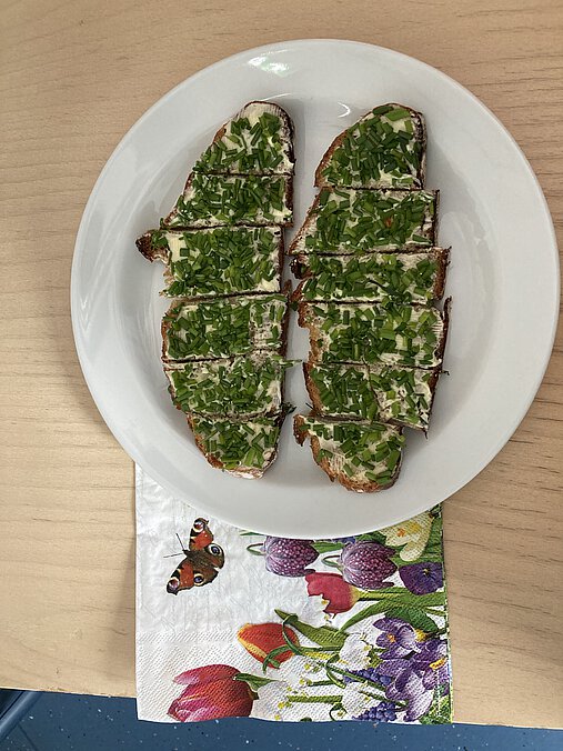 Die Brotscheiben großzügig mit Butter bestreichen. Den gehackten Schnittlauch gleichmäßig darüberstreuen – je nach Geschmack auch etwas mehr.