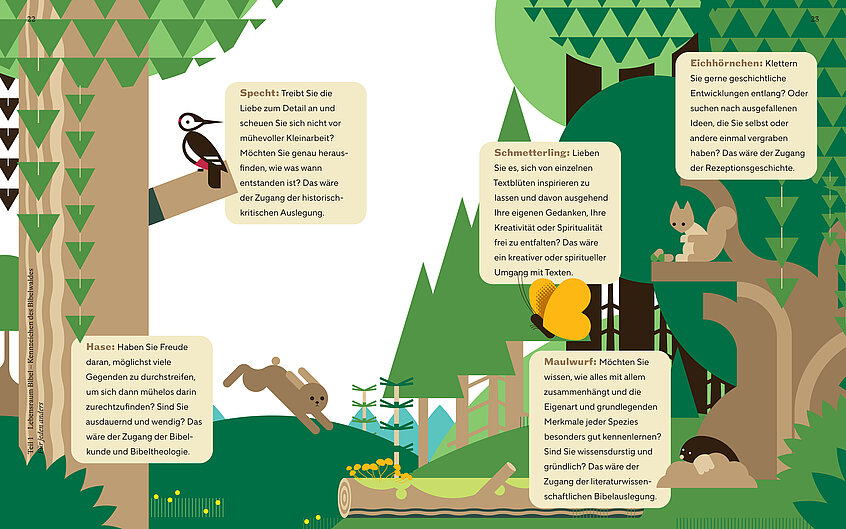 Diese Tiere haben keine Aufgabe, sie verdeutlichen, welche Lesetypen es gibt. Es gibt in meinem Buch fünf verschiedene Arten von Leserinnen und Lesern. Die „Spechte“ wollen es ganz genau wissen, die klopfen solange an ein und derselben Stelle, bis sie alles darüber wissen. Das wäre etwa die bibelwissenschaftliche Methode. Es gibt aber auch „Hasen“, die sich gerne einen ganz großen Überblick verschaffen, gerne viele Texte lesen und das Ganze kennenlernen. Es gibt auch die „Maulwürfe“, die Bezüge zwischen biblischen Texten gleichsam ausgraben oder dahin durchgraben möchten. Das „Eichhörnchen“ wiederum geht den Baum entlang und schaut, was aus so einem Baum wird. Also: Was hat die Auslegungsgeschichte aus so einem Baum entstehen lassen? Und dann natürlich auch den „Schmetterling“, den mögen sehr viele. Der „Schmetterling“ pflückt sich gleichsam einen Bibelvers und entschwindet in spirituelle oder sonstige Höhen und hat genug genippt, wenn er einen kleinen Vers gelesen hat.