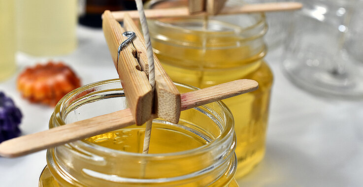 Außerdem brauchen Sie Dochte. Zudem ein paar Kluppen oder Eisstäbchen, mit denen der Docht an der richtigen Position gehalten werden kann.
